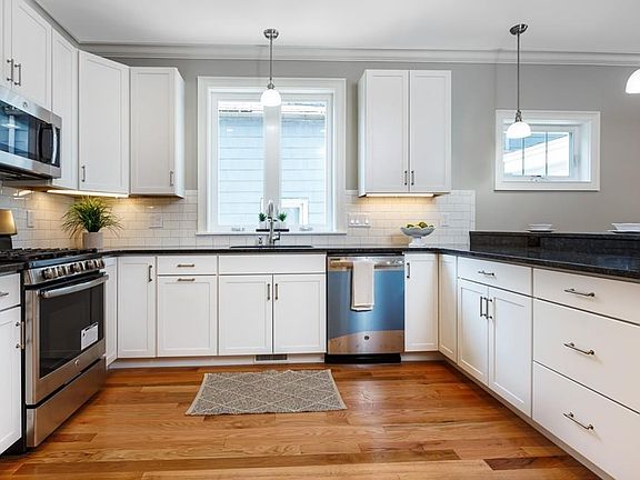 This bright, spacious, 3 level floor plan features: 3brs/3.5baths, extra high ceilings, crown molding, stainless steel & granite kitchen with a high-end appliance package, large living room and great room. Gleaming oak hardwood floors, spa-like bathrooms with granite & tile, walk-in closets, beautiful bedrooms including a large master suite. LED recessed lighting throughout, ultra-efficient Hydro-Air heating system, EVR air quality system, central A/C, central vacuum, in-unit laundry, and security system. Amazing location very close to the commuter train, shops, restaurants, grocery stores, parks, pond, and hospital.
