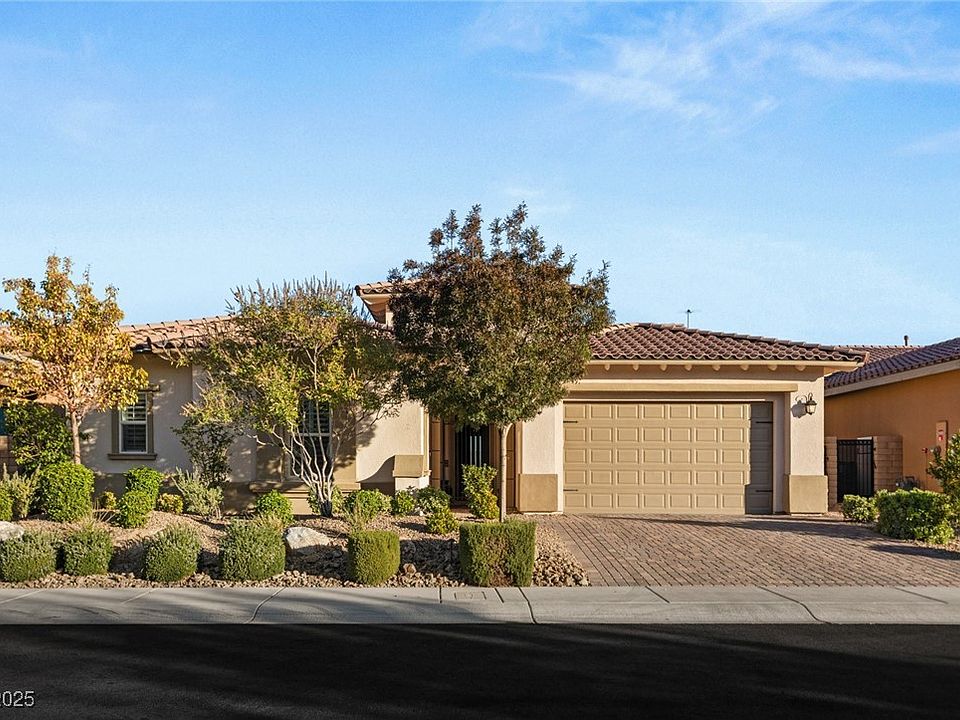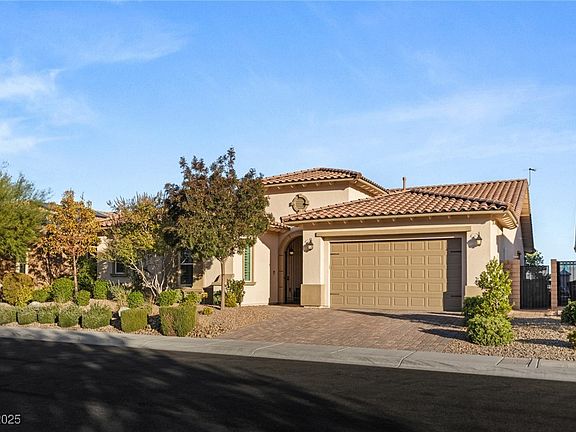 Luxury Toll Brothers single-story home in Montecito on a premier elevated cul-de-sac lot with unobstructed Strip views. A gated courtyard and paver-lined entry lead inside to a bright open layout with stacking sliders, a sleek fireplace, and a custom Acoustic Design sound system. The kitchen features a waterfall-edge island with bistro seating, black stainless appliances, ample counter space, and a large walk-in pantry. The primary suite offers French doors to the backyard, a jetted soaking tub, walk-in shower, and double vanities. Additional highlights include plantation shutters, a spacious laundry room with sink, and a 3-car garage with epoxy floors and overhead storage. The backyard features a covered paver patio, built-in fire pit, and multiple seating areas to enjoy panoramic city and Strip views. Homes with this blend of luxury, privacy, and vistas rarely come to market.