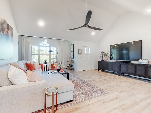 Private 1.32 acre lot borders woods on two sides. Quartz counters, white cabinets, chic backsplash & expanded island in kitchen. Upgraded wood flooring throughout (no carpet!). Upgraded lighting & designer tile in wet areas. Custom closet built-ins in primary closet, laundry access through the primary bedroom closet, Expanded tile shower, w/ glass door in the primary bath. HUGE 1200 sqft TREX deck was just added in May. Ceiling fans in pictures do not come with house, they are being replaced with different model.