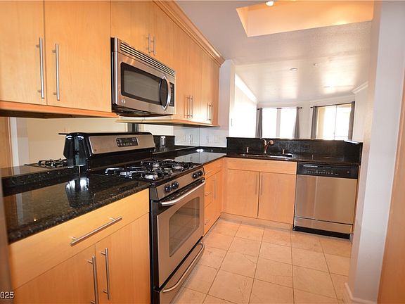 Upgraded Luxury Condo just minutes from the heart of the Las Vegas Strip! This property features lots of natural light, clean, and move-in ready, this 2-bedroom, 2-bath condo offers comfort with a touch of Strip excitement. The living room and primary bedroom capture a partial Strip view. Inside, you will find a modern open layout with marble/stone and luxury vinyl flooring, an updated kitchen with granite counters and stainless appliances, and a walk-in shower connected to the primary suite. A front-load washer/dryer adds everyday convenience. This 16-acre gated community delivers true resort living, a large pool and spa, gym with sauna, tennis and pickle-ball courts, racquetball, BBQ areas, and 24-hour access to many amenities. All of this just 1.5 blocks from the Strip, close enough to enjoy it, far enough to relax.