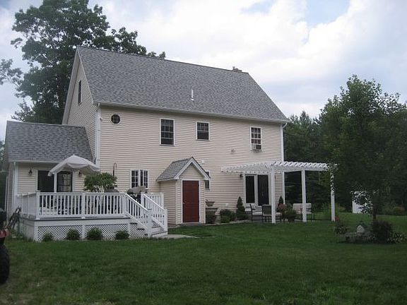 BETTER THAN NEW! Meticulous 7 year old Colonial on scenic road with attention to detail inside & out. Only few minutes to town and Route 12. Hardwood floors with Mahogany borders in mudroom & kitchen. Crown and raised panel moldings. Master Bedroom with jetted tub & 8'x8' walk-in closet. Custom closet cabinetry in all bedrooms. Propane fireplace in living room. Media room on 3rd floor with surround sound & 55” TV to stay. Trex decking & vinyl railings on farmers porch and 16'x22' back deck. Bluestone patio with vinyl pergola. Professionally landscaped with irrigation system. 2x6 Construction. Central Vac. Invisible dog fencing. 4 Bedroom septic.