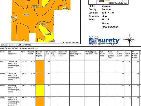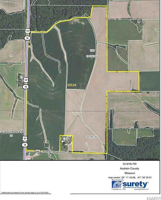 This is a nice 95% tillable farm in Audrain County just South of Laddonia on Hwy 54/19 with approximately 3/4 mile Hwy Road frontage. Soil types include Armstrong, Leonard, Mexico, Twomile and Belknap. Has a NCCPI Rating of 66.2. There is a natural gas pipeline easement along the west side of the farm running north & south. Additionally, there is a residential tap available for use from this line. The farm has 260 tillable acres, and it has a Windmill Lease in place. The farm income for 2025 is $146,500. Call listing agent for further details on income or the windmill lease.