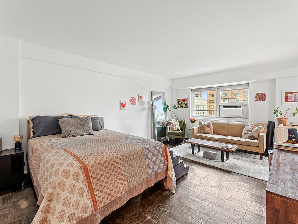This spacious studio is located on the 14th floor and has both North and West exposures, bringing in lots of afternoon sunlight! The well designed layout features a windowed eat-in kitchen with full size appliances including a dishwasher, three closets, a dressing room area, and a tiled bathroom.