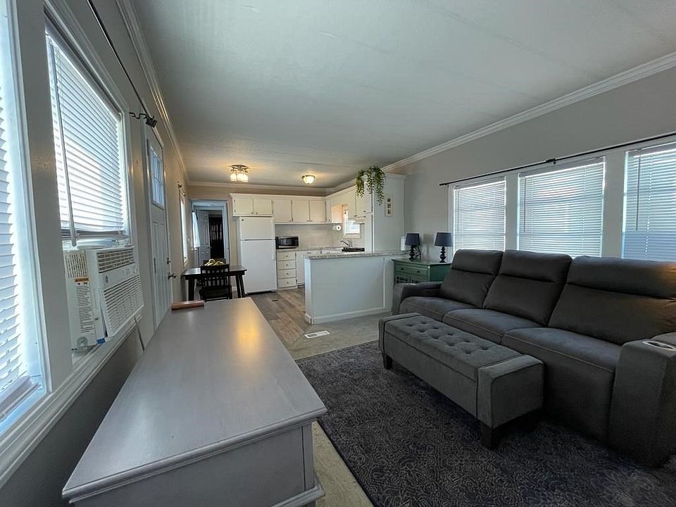 Come see this beautifully maintained 2 bedroom home in Chelmsford Commons. Recently renovated in 2021 this home features newer flooring, freshly painted, crown molding, light fixtures, and more. The open concept kitchen and family room was updated in 2021 with new flooring, countertops, sink, new gas stove, and refrigerator in 2021. The bathroom was updated with new vanity, and tile shower. Both bedrooms accommodate queen size beds. Other updates include new electrical panel 2021, and new hot water heater 2021. This home features plenty of parking in the driveway(about 4 cars) & a very nice storage shed. This home used to have central a/c but it currently does not work/sold as is. Seller will include 2 window a/c units. Great location close to Rt 3 and Rt 495. Chelmsford Commons is pet friendly, and the park fee includes landscaping and snow removal for the common area, taxes, water and sewer, trash, and on-site person. Buyers must be approved by the park before closing.