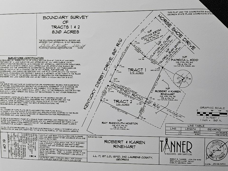 Listing is for the 5.75 acres only on Tract 1 of Boundary survey. Exceptional Building Opportunity on 5.75 acres in Horse Shoe Place- Horses Welcome! Discover your dream property nestled at the scenic corner of Kentucky Derby Drive and Mullis Barn Lane. This expansive 5.75-acre lot presents a rare and coveted opportunity to build your dream residence in a serene county setting. With its lush landscapes and tranquil surroundings, it's a slice of paradise awaiting your vision. Prime Location: Situated with road frontage on Kentucky Derby Drive, this lot affords easy access combined with peaceful privacy. Equestrian Friendly: Horse enthusiasts will delight in the freedom to keep horses, a rare find that adds to the charm of this property. Natural Beauty: The land's natural beauty, featuring mature trees and a gentle landscape, offers an idyllic backdrop for your future home. Whether you're envisioning a sprawling country estate, a cozy family home, or a haven for your horses, this lot promises a future where your dreams can take root and flourish. NO HOA nor HOA fees but there are restrictive covenants. Mobile homes are prohibited.