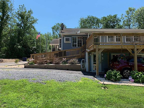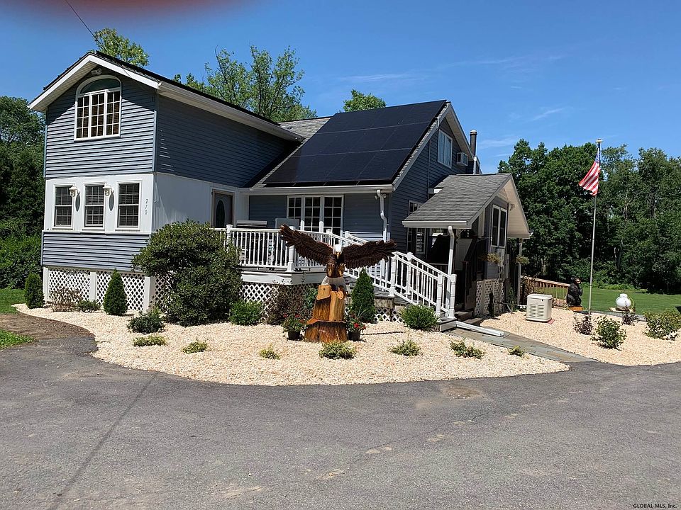 This unique property includes an apartment on the lower level and guest quarters over the large 3 car garage on over 2 acres. Main house has 4 bedrooms, 2 full baths, large eat-in kitchen, family room, 12x40 four season room with pellet stove that overlooks the landscaped backyard. Includes Generac generator. Lower level apartment includes 2 large bedrooms, full bath, eat-in kitchen, family room with direct vent gas stove, office area and private entrance. This unit can be easily made handicapped accessible. Guest quarters located over garage has it's own kitchen, 1 bedroom and full bath with laundry. Can also be used as an office. Let the solar panels save on your electric bill (new owner will take over lease of panels). Wooden bear and eagle sculptures excluded from sale.