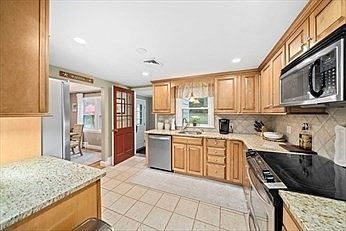 Downsizing? Perfect one level Ranch style home. Set back on an acre plus lot. Private setting. Spacious backyard patio. Location: close to shopping, restaurants, beaches and golf course. Open floor plan great space for entertaining. Sunlight abounds through this cozy home. Living room with fireplace and access to the dining room. Perfect working area in the updated kitchen with access to the back patio area. However, if more space needed the lower level could be renovated for a Family room, office or game area. Already has a full bath in that area. Three bedrooms. Walk up attic.