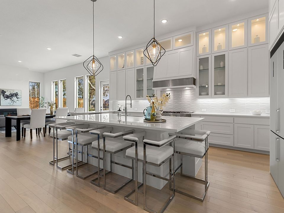High-end upgrades are showcased throughout, beginning in the light-filled kitchen and living areas. An oversized island anchors the kitchen, complemented by a 48-inch built-in refrigerator, wine and beverage refrigerator, premium KitchenAid appliances, and cabinetry extending to the ceiling. Additional windows were intentionally added to capture peaceful water and green space views, while designer lighting enhances the home’s clean, modern aesthetic.