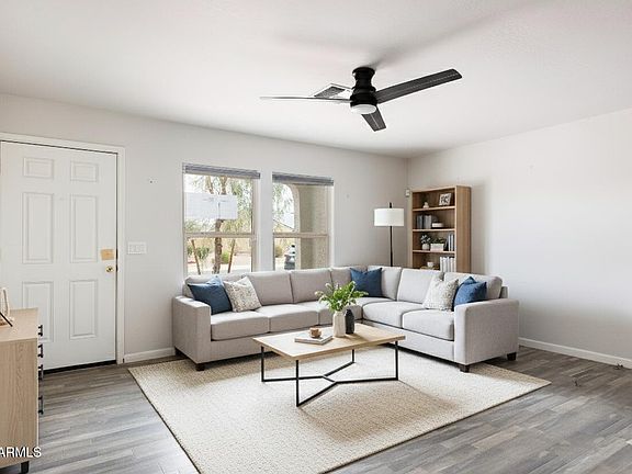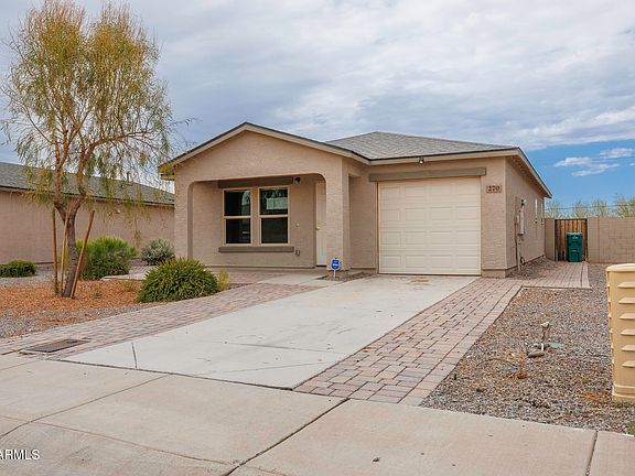 Charming 3-bedroom HUD home build in 2021! This property features easy-care landscapping, a cozy front porch, and a 1-car garage with an extended driveway. Inside, the open floor plan is filled with natural light, wood-look flooring throughout the main living areas and carpet in the bedrooms. The kitchen offers granite countertops and plenty of cabinet space. The primary suite includes its own private bath. Out back, enjoy a spacious yard complete with a paver patio and artificial turf-perfect for relaxing or entertaining. Great location with quick access to AZ-87 and I-10.