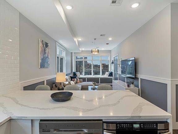 Built in 2020, this boutique walk-up building offers privacy and low-density living just MINUTES from the Journal Square PATH. Inside, the open-concept layout is filled with natural light and finished with hardwood floors throughout. The kitchen showcases Calacatta marble-patterned quartz countertops, custom Cubitac cabinetry, and stainless steel appliances. Two full bathrooms and an in-unit washer and dryer add convenience to the sleek, modern design.