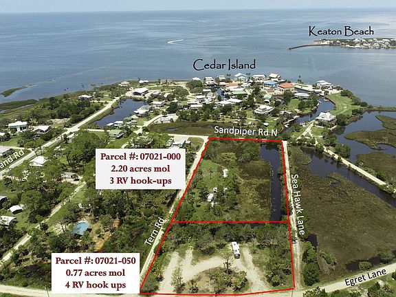 Welcome to Cedar Island, a picturesque property offering a fantastic opportunity for those seeking a recreational haven or a wanting to start a lucrative business venture. Situated on 2.2 acres, this stunning property boasts three spacious RV sites that can be rented out individually or collectively, making it an ideal investment opportunity. A fourth RV site has electric and water and only needs the septic hook-up installed. Nestled in the heart of the Keaton Beach Community, this property offers the perfect combination of tranquility and adventure. For those with a keen angling spirit, a saltwater canal on the premises provides excellent fishing opportunities, with trout and redfish aplenty. Although direct Gulf access is not available, a public boat ramp located a mere 1.2 miles away allows for easy exploration of the stunning coastal waters. Each RV site is thoughtfully equipped with its own electric, city water, and city sewer hook-ups, ensuring maximum convenience for guests. Whether they are seeking a weekend escape or a long-term stay, visitors will appreciate the comfort and functionality offered by these well-appointed sites. Fulfill that dream of owning your own business along with flexibility of not being tied to a storefront. As an added bonus, an adjoining lot of approximately 0.77 acres is also available for purchase, featuring an additional four RV sites. This presents a unique chance to expand the business potential of the property, accommodating even more guests and generating additional income. Ask about the adjoining lot for all the details. Beyond the boundaries of this remarkable property, the surrounding Cedar Island offers breathtaking coastal views that will leave visitors in awe. Its natural beauty sets the stage for an array of outdoor activities, such as fishing, scalloping, hanging out at Grassy Island and other summer adventures. Immerse yourself in the serenity of the Gulf Coast, with endless opportunities for relaxation and excitement just moments away. Don't miss out on this extraordinary chance to own a slice of paradise in Keaton Beach. Whether you're looking to capitalize on the rental potential or simply indulge in your own coastal retreat, this property is sure to exceed your expectations. Embrace the charm of Cedar Island and create unforgettable memories amidst its captivating landscapes. Even more area to explore is Hagan's Cove, just 6 miles away with Keaton Beach being 4 miles away. This gorgeous property is in the center of everything in the Beaches area.