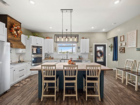 Inside, the home offers a welcoming open floor plan with 10-foot ceilings and a massive living room anchored by a stone-surrounded wood-burning stove. The kitchen is a true standout—white cabinetry with warm wood accents, granite countertops, butcher block island, and a window over the sink framing the pasture views. A walk-in pantry with cabinets, open shelving, and a water spigot for filling your coffee pot is both practical and clever.