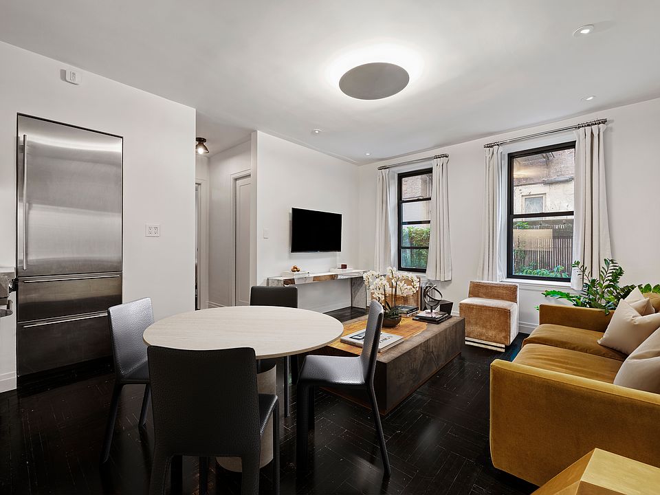 Situated on one of the West Village's most pristine tree-lined blocks, this beautifully appointed one-bedroom home offers modern convenience coupled with all the charm of quintessential Village living. Step into a dedicated entry foyer with a convenient coat closet that opens into a spacious living area, adorned with rich, dark-stained parquet hardwood floors.