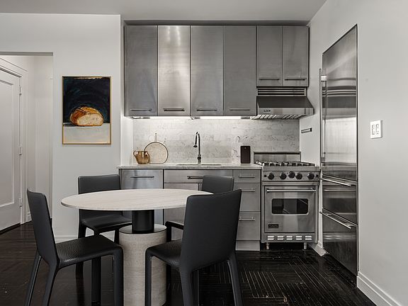 The modern, eat-in kitchen is thoughtfully designed with custom stainless steel cabinetry, Carrara marble countertops, under-cabinet lighting, and premium appliances from Viking to Sub-Zero. A custom-built office nook creates a perfect work-from-home space and seamlessly connects to the bedroom, which boasts a full wall of built-in closets and exceptional storage.