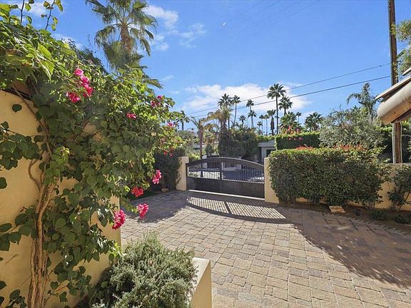 Sequestered behind custom motorized entry gates and ideally positioned to welcome magnificent mountain views, this custom Spanish villa offers a prime address within South Palm Springs' historic community of The Mesa. A street-level motor court and split three-car garage provide an impressive introduction to the residence, which offers 4 bedrooms and 3.5 baths including a casita. Built in 2007, the spacious design of approx. 2,407 s.f. blends timeless Old World elegance with today's preferred amenities. Most rooms including the casita open to a spacious and enviably private courtyard that enhances entertaining and daily living with a beautiful pool and spa, a waterfall, and wraparound patios for outdoor dining and relaxation. Enjoy a family room with handsome masonry fireplace and two sets of French doors opening to the courtyard, and a seamless living, dining and kitchen area that leads to a covered balcony with sweeping mountain and evening-light views. Chefs of all skill levels will appreciate the kitchen's island, granite countertops, full tile backsplash, custom cabinetry that reaches the ceiling, and top appliances including a Viking range and a built-in refrigerator. Two bedrooms share a bath, and the luxurious primary suite is warmed by a stacked-stone fireplace and hosts French-door access to the courtyard, a jetted tub, walk-in rain shower, built-in recessed cabinetry, laundry closet, and a 20' long walk-in closet with furniture-caliber built-ins.