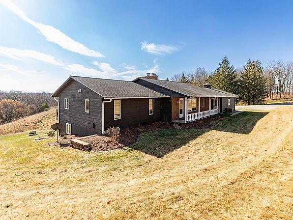 Picturesque setting on 5 acres just 15 minutes from Rochester. Walk out ranch style home sits on hillside with panoramic views in every direction from your huge maintenance free Trex deck with Westbury deck railings. This beautiful home features main floor master suite with ensuite, double see through fireplace connects the living room and kitchen dining room area, plus spacious laundry/mud room area. Open staircase to lower level has solid oak treads & stringers and features 2 bedrooms, 2 full bathrooms, family room with cozy fireplace, office area and lots of storage. Newer mechanicals include boiler with on demand heating baseboard, water heater, and A/C. 50x54 shed complete with concrete floor, water hydrant and is completely wired. 45x75 garden with 6 foot high fence is a gardeners paradise. Take a tour today.