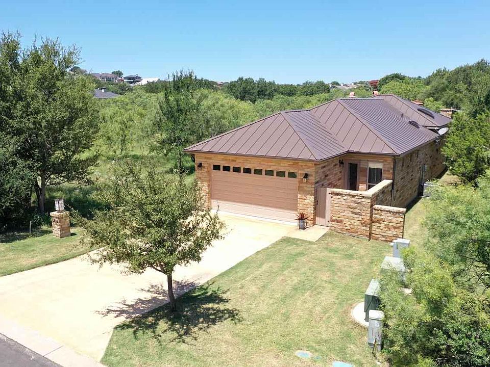 You will be delighted with this exceptional custom-built home located across the street from the golf course in the highly desirable neighborhood of Horseshoe Bay West. This single level home is accentuated with a crisp, clean color palette complemented by striking modern finishes. The thoughtful floor plan offers the most comfortable open layout with the kitchen, dining and living area designed to be the central focus. Throughout the home you will enjoy 10-foot ceilings, 8-foot doors, porcelain plank tile, and numerous upgrades. The chef will surely appreciate the light and airy kitchen with skylight, handcrafted shaker cabinetry, granite counters and a full complement of stainless-steel appliances. The spacious master suite offers a comfortable sitting area and access to a private courtyard. The master bath features his and her sinks with granite countertops, large walk-in closet, and a beautifully tiled shower. Friends and family will love the private guest suite featuring an en suite bath with granite counters, tiled shower/tub combo and large walk-in closet. Other amenities include a floor to ceiling masonry fireplace, 2-car garage, water softener, standing seam metal roof, sprinkler system, easy to maintain yard, and a sizeable covered rear patio with wood burning fireplace. Don't miss this chance to purchase an awesome lock and leave or full time home at such an affordable price point.