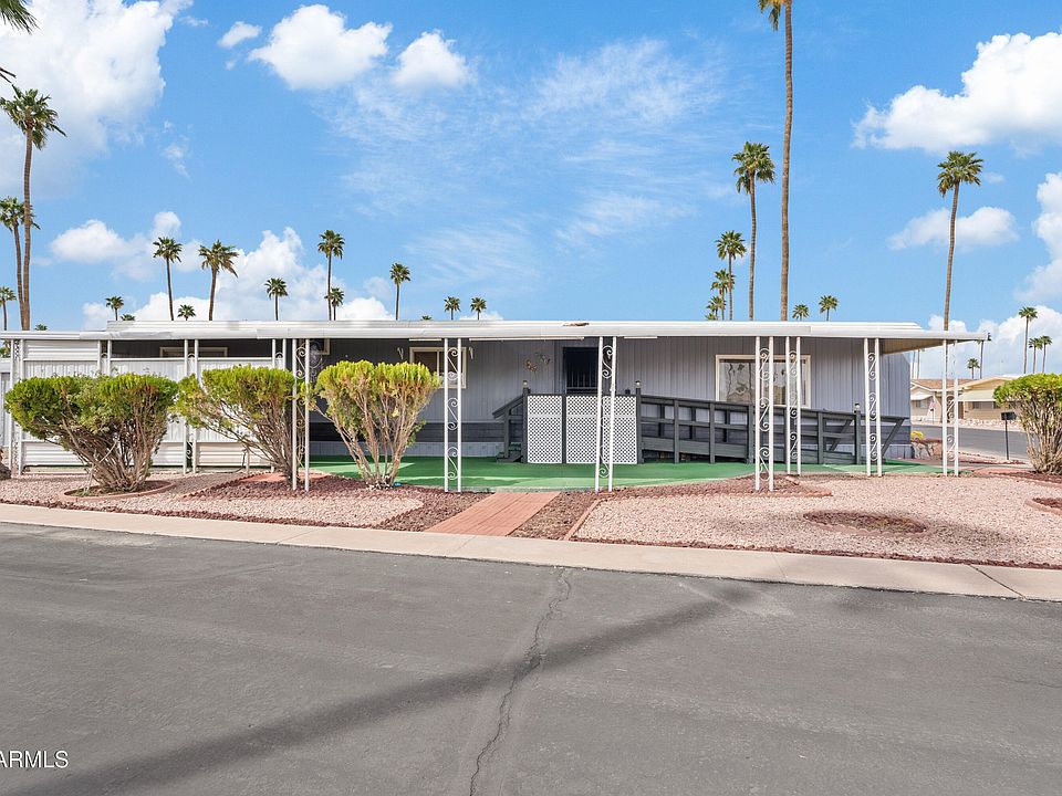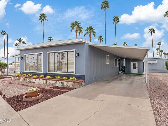This charming manufactured home is nestled in an age-restricted community near the bustling heart of downtown Mesa! Just minutes from major freeways and perfectly positioned near vibrant entertainment, gourmet dining and retail treasures, this location blends the best of city living with comfort and ease. The home features a spacious layout, ideal for relaxed living, with modern touches and plenty of natural light. Outside you'll enjoy the beauty of Arizona, with low-maintenance landscape and the peaceful escape of a covered patio on this private corner lot. Don't miss this opportunity to live where convenience meets leisure!