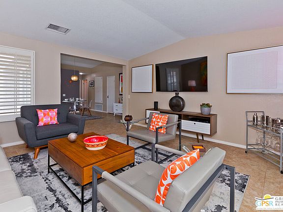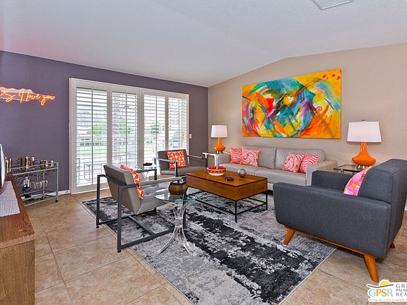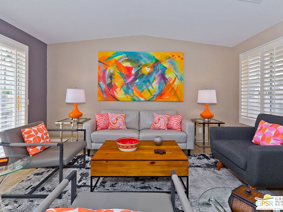 Mountain views from every room! Short-term rentals allowed! Fee simple land you own the land! Located in South Palm Springs this turn-key furnished 2 bed 2 bath upper end unit won't last long. Stainless steel appliances. Updated cabinetry throughout with granite counter tops. Walk-in fully tiled glass enclosed showers in both the primary and guest bath. Stocked and furnished for short-term rental use. This condo is ready for its next investor. Pool and spa heated for the winter months just steps away from the unit. Access to tennis courts. The CV Link is just outside the gates. HOA includes water, trash, sewer and cable TV. Covered parking in the gated community. Offers to be reviewed Sept. 29.