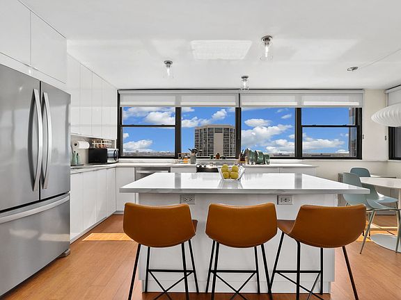 Experience luxury city living at its finest in this stunning and completely renovated one-bedroom, one-bathroom corner unit on the 17th floor of a boutique full-amenity building in coveted East Lincoln Park! Boasting panoramic views to the north and west, this home offers a front-row seat to vibrant cityscapes, breathtaking sunsets, and the bustling city life that Chicago is renowned for. Inside you will be greeted by a spacious open-concept floor plan with soaring ceilings, gorgeous designer finishes, custom window shades, and sustainable wide-plank bamboo floors.The kitchen is a true showstopper, complete with sleek white soft-close cabinets, luxe quartz countertops, high-end stainless steel appliances, and an island with a breakfast bar that overlooks a sun-drenched living room with a separate dining nook and plenty of space to accommodate a work-from-home office. The generous bedroom doesn't compromise on comfort, offering a spacious layout and a large organized custom closet. The tastefully remodeled bathroom features a double vanity, soothing soaking tub, and exquisite tilework that echoes the home's luxurious aesthetic. Tons of storage throughout, with four closets all outfitted with Elfa organizers! Residents of 2700 N Hampden Court enjoy a wealth of amenities, including a rooftop pool and sundeck with incredible city views, on-site maintenance and door staff, a workout room, a dog wash station, and storage & laundry facilities. Assessments include water, trash removal, and a cable & internet package with HBO! Option to purchase the home fully (or partially) furnished - inquire for more details. Unbeatable location on a quiet tree-lined street just moments from the tranquil lakefront, lush parks, convenient transportation, and all of the wonderful dining, shopping, cafes, nightlife & entertainment this lively neighborhood has to offer. Your chic Lincoln Park lifestyle begins here. Welcome home!