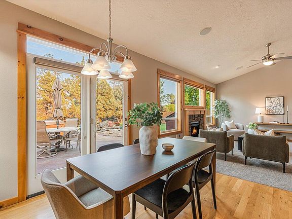 Welcome to this thoughtfully designed single-level craftsman home that combines comfort, accessibility, and peace of mind. With 3 bedrooms, 2.1 bathrooms, and a den, the open floor plan features soaring ceilings, rich wood trim, Hunter Douglas blinds, and a cozy gas fireplace.The primary suite includes a walk-in closet, a spacious bathroom with double vanities and a large dual-head walk-in shower with grab bar. Step-free entries and zero-threshold doors throughout provide aging-in-place convenience and easy mobility. Outside, enjoy a private canyon outlook in a rare Redmond setting. Professionally landscaped grounds feature winding paths, rock accents, juniper trees, and a canyon-viewing terrace. The landscaping is beautifully illuminated for evening enjoyment, creating a warm backdrop for relaxing in the hot tub or entertaining on the expansive patio. Multi-zone irrigation ensures easy upkeep, while the oversized driveway and flatwork provide seamless access to the 3-car garage.