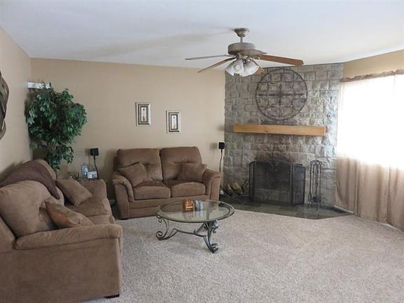 No steps in this beautiful all brick ranch. Neutral decor with new carpet, kitchen flooring, counters and remodeled bath. Open floor plan w/ counter bar, stone fireplace and new paint. Country living at its best!