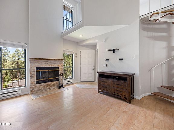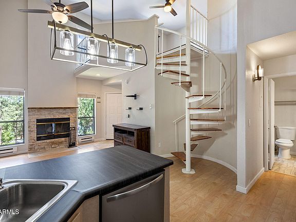 Welcome to your serene mountain retreat at The Pines #1022—an 800 sq ft, upper-level sanctuary perfectly nestled among Show Low's Ponderosa pines. This Open living space is defined by soaring vaulted ceilings, a cozy stone-front fireplace, and rich laminate floors that flow seamlessly into a bright kitchen. Here, stainless appliances, sleek black countertops, and a breakfast bar await your morning coffee or casual dinner gatherings. Main level features 1 bedroom and bathroom, kitchen & living room. A graceful spiral staircase leads you upstairs to the upper loft/bedroom carpeted for comfort and outfitted with ceiling fans and mountain-view windows. Enjoy the ease of low-maintenance, just minutes from local shops, dining, lakes, and hiking trails, this home delivers the perfect blend of convenience and peaceful woodland living.