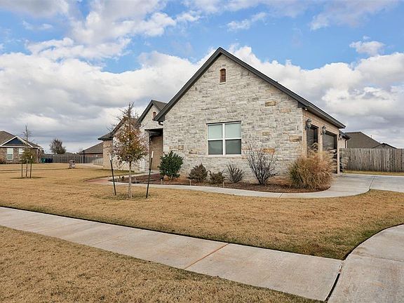 Stunning 4-Bed + Study / Formal Dining • 2.1 Baths • 3-Car Garage • CORNER LOT • Mustang Schools. This gorgeous corner-lot home will leave you speechless! Complete with a full perimeter fence and a 6-person storm shelter, this property offers both beauty and peace of mind. Step inside to an inviting entryway that connects to a formal dining room and flows effortlessly into a spacious, open-concept living area featuring a vaulted ceiling with a designer beam, a gas log fireplace, and large windows overlooking the covered patio and expansive backyard. The impressive kitchen includes: Built-in appliances, Double ovens, Floor-to-ceiling cabinetry, A large island with granite countertops, Walk-in pantry,