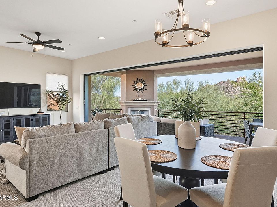 Experience elevated desert living in this luxurious townhouse set within an exclusive gated community in Troon North. Surrounded by dramatic mountain vistas and iconic boulder formations, this residence offers a seamless open floor plan featuring an expansive great room, formal dining, and a 16-ft glass pocket wall opening to a spacious covered balcony with gas fireplace—perfect for alfresco living. The designer kitchen showcases sleek wood cabinetry, quartz countertops, Thermador appliances (Gas Cooktop), and a large island with seating. The elegant primary suite offers balcony access, a spa-inspired bath with soaking tub, dual vanities, and custom walk-in closet. Two additional bedrooms, one en-suite with a private balcony and views of Pinnacle Peak. With three balconies (see more) offering stunning vistas and refined finishes throughout, this residence captures the essence of luxury desert living in one of North Scottsdale's most coveted settings. The community offers a Pool, Workout facility, and BBQ area for resident's enjoyment.