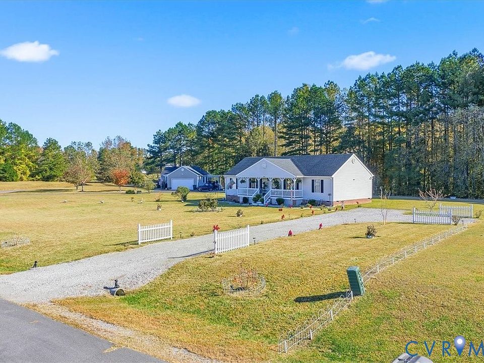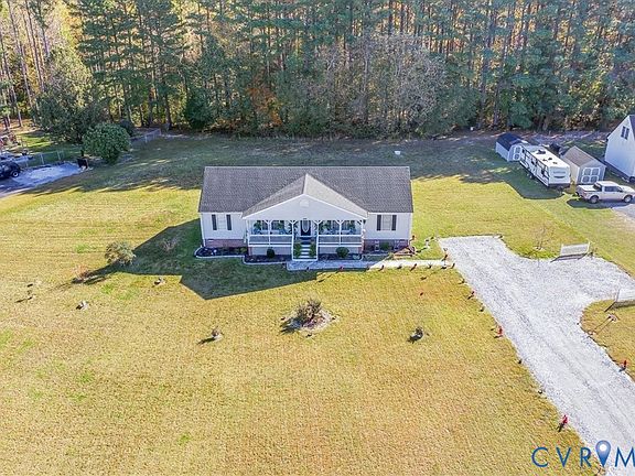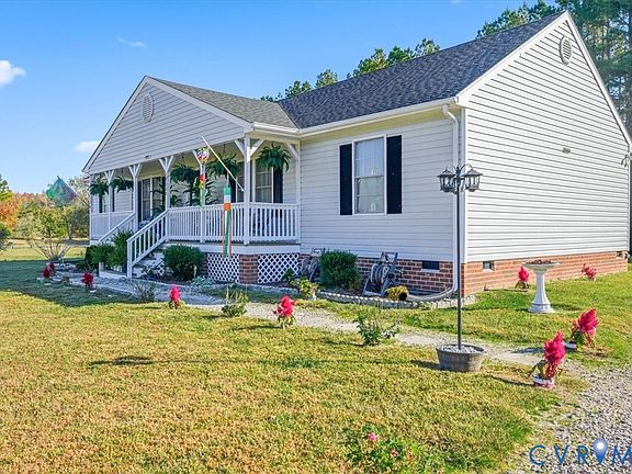 Say hello to this little slice of paradise in this quiet pocket of Dinwiddie County! Ideally located close enough to the city for shopping, dining, medical, and travel convenience, while also being far enough away for quiet enjoyment in your own back yard. This home is situated on a beautiful 1.5-acre lot, featuring a large gravel driveway with plenty of parking space, garden borders with an array of flowers and plants to enjoy in the spring, peach trees, and ample space to add your homesteading projects! You're offered a warm welcome onto a full country porch and into the bright foyer of this home. To the right you'll find a spacious morning room with a large window for plenty of sunlight, ideal for entertaining, and to the left you'll find the formal dining area with beautiful chair and crown moldings and decorative lighting. Through the entry hall, you're welcomed into a spacious living area with a vaulted ceiling, chandelier, corner fireplace, access to the kitchen area and sliding doors to the back deck. The kitchen offers ample cabinetry, bar-top seating, a vaulted ceiling and access to the laundry room and primary bedroom. This primary bedroom has a generous amount of space, and offers a double closet, walk-in closet, and en-suite bath with a jacuzzi tub, walk-in shower, and a double vanity. The other end of the home holds a pull-down attic with flooring available for storage, a full shared bath, linen closet, and two spacious bedrooms, each with a double closet for storage. The rear of this property completes this home with a gazebo on the deck, separate patio with a small gazebo for the grill, and the wood line to offer maximum privacy. Roof replaced in 2024, HW Tank 2025.