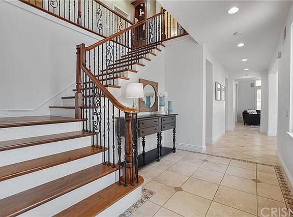 Welcome home to prestigious, Valencia Westridge! Located on a corner lot behind the gates, this turnkey home displays true pride of ownership. Attractive curb appeal upon arrival and details in every corner. This open floor plan offers a full bed & bath plus office downstairs and 4 bedrooms up, including a spacious master with en suite bathroom. The chef's kitchen boasts granite counters, a large center island, butler's pantry and an open concept. Enjoy the well manicured yard with outdoor kitchen, built in BBQ, professional hardscape, and hillside views. Upgraded wood & tile floors throughout plus fresh paint. French doors lead to your private patio with charming fountain. Other desirable upgrades include shutters throughout, crown molding, garage with cabinets, and ceiling fans. The Westridge community offers some of the highest rated schools in California, plus association pools, tennis courts, club house & no Mello Roos! Walk to nearby parks, schools, and restaurants. Golf at the distinguished Tournament Player's Club course, only a few blocks away. This home has all you're looking for and more!