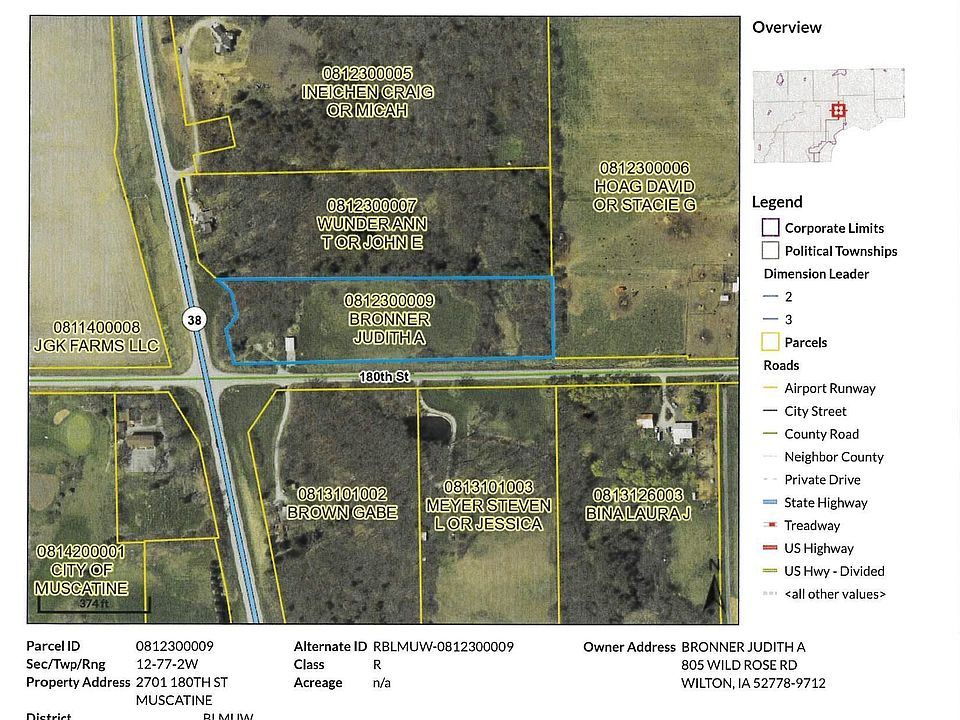 PERFECT LOCATION FOR YOUR NEW HOME! This 6.44 Acre lot is located on the corner of Highway 38 and 180th Street just North of Muscatine. The house has been removed and there is a 24' x 40' outbuilding. Partially wooded lot. Buyer will need to install new well and septic and check with Muscatine County for building requirements. PAVED ROAD properties with no houses on them do not come up very often!