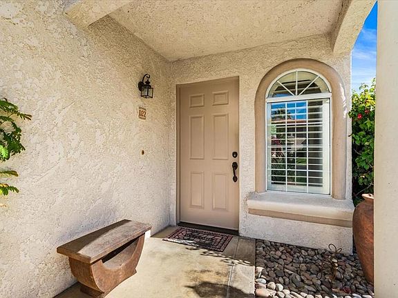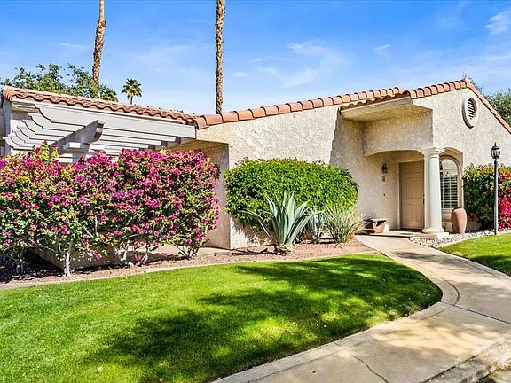 Tucked away in the highly coveted Mesquite Country Club, this exquisite 1-bedroom, 1-bathroom, 797 sq. ft. single-level condo offers an unparalleled blend of privacy, luxury, and mountain views. Unlike many others, this duplex-style bungalow is one of only two units, standing alone in the serene Southeast corner of Phase 4, offering ultimate tranquility and exclusivity.Surrounded by lush landscapes and panoramic mountain vistas, this residence is perfectly positioned near tennis and pickleball courts, as well as a resort-style pool and spa. Designed for seamless indoor-outdoor living, the home boasts two private patios, ideal for alfresco dining or soaking in the desert sun.A complete 2011 renovation elevated this home with granite countertops, sleek stainless-steel appliances, and custom cabinetry in the kitchen, while the spa-like bathroom features an updated vanity, granite finishes, and elegant lighting. The timeless tile flooring throughout enhances the modern aesthetic and provides effortless maintenance.Lovingly maintained as a secondary residence and never leased, this condo is offered fully furnished, providing a turnkey opportunity for discerning buyers. The perfect lock and leave Palm Springs pied-a-terre or take advantage of the min 7 day rental guidelines in the HOA for a great investment opportunity. Embrace the serene desert lifestyle in a residence that harmoniously blends sophistication, comfort, and exclusivity.