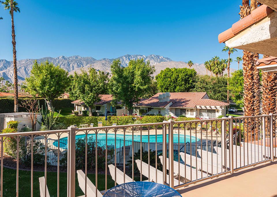- Top floor updated 2BR/2BA condo at the highly sought after Phase 4 development of the Mesquite Country Club in South Palm Springs- This top floor west facing corner unit is ideally located in the community to take advantage of full on Mountain views and natural sunlight- The formal living room with vaulted ceiling enjoys direct access though sliding glass doors to a large private deck to further enjoy the view and allow for indoor/outdoor entertaining- Classic kitchen with newer appliances awaits your personal touch- Large primary bedroom with an ensuite bath with excellent closet space also has sliding glass doors directly to a large view deck- The good sized guest bedroom has it's own private patio- The separation of bedrooms and baths allow for maximum privacy for guests- Beautiful newer vinyl flooring throughout, travertine flooring in the bathrooms and solid pine doors with heavy bronze hardware give the home a sophisticated feel- Private stacked washer & dryer- Private covered parking spot with plenty of guest parking- On fee land - property is not on leased land - HOA amenities include tennis and pickleball courts, swimming pools and spas- Adjacent to the Prescott Preserve with hiking trails, the land is currently being restored to a beautiful native desert habitat - HOA Dues: $508/mo. (includes garbage, water, insurance, cable TV, internet, professional management and more)- Built in 1984 and 1175 sq ft (per Realist Property Detail - not verified by sellers or agent) - Mesquite Country Club is conveniently located minutes from downtown and the airport