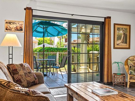 HUGE PRICE IMPROVEMENT! Gorgeous remodeled condo on Fee Land available in highly desirable Mesquite Country Club located in beautiful south Palm Springs. This spacious ground-level condo has been beautifully updated with new kitchen cabinets, appliances, faucet, granite countertops, new bath vanities, custom blinds and brand new energy-efficient double paned windows and sliders. There are 2 private, gated and tiled patios that provide ample entertaining spaces for you and your guests. Condo is being sold turnkey furnished,which includes furniture, furnishings and artwork. The kitchen is fully stocked with dishes, small appliances and cookware. The low monthly HOA fee includes premium cable and internet, trash, water and sewer, as well as access to multiple pools/spas, tennis/pickleball and nearby nature trails. MCC allows short-term rentals (min. 7 days) which allowed this property to be a successful part-time vacation rental (rental history available) from 2021-2023 or it could be your year round Palm Springs residence or investment property.