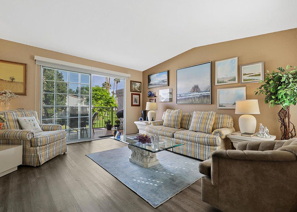 Beautifully updated upper-level 2-bedroom, 2-bath condo with stunning mountain views, nestled in the desirable Mesquite Country Club! This light and airy unit features recessed lighting, high ceilings, custom window coverings, and an open floor plan. The remodeled kitchen boasts granite countertops, stainless steel appliances, and luxury vinyl flooring throughout (except baths). Both bathrooms have been tastefully updated. The spacious primary suite offers a private balcony perfect for enjoying morning coffee and peaceful views. The guest bedroom also enjoys magnificent mountain views and its own balcony! Additional highlights include a newer HVAC ( Furnace & Airco ) installed 1 year ago). Mesquite CC offers an exceptional lifestyle with five pools and spas, tennis and pickleball courts, and the scenic 110-acre Prescott Preserve just beyond the gates. Low HOA dues, fee land, and short-term rental friendly (7-day minimum). Close to dining, shopping, and downtown Palm Springs. Ideal as a primary home, vacation retreat, or investment property. Call today!