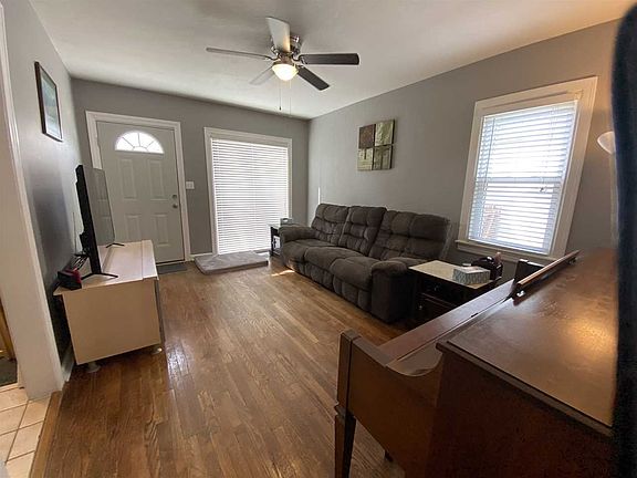 Charming home in the middle of town, just off of Stringtown. Located on a corner lot, this two bedroom, one bath home will become your own little haven. With an updated bath, beautiful floors and bright paint colors, you will only need to move right in! The living room has lots of natural light from the large front window. The eat-in kitchen is off of the living room and it leads to the large fenced back yard. The wood deck, large grassy area, and included trampoline make this yard the perfect place for a summer party. A detached two car garage is located at the end of the yard. Check out this charmer today!