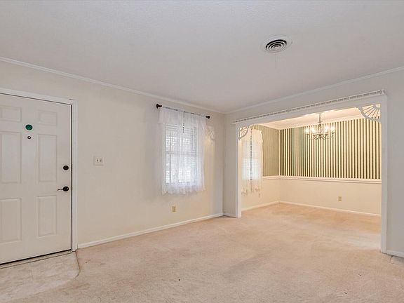 This solid brick ranch-style home features an architectural roof and some modern updates. You will enjoy the privacy the corner lot provides while sitting on the front porch. This home offers a functional layout and a variety of standout features. You'll find crown molding and chair rail accents in the dining room and kitchen, while additional crown molding enhances the hallway and family room along with vinyl windows throughout. The kitchen has a Kitchenaid dishwasher and SS appliances. Sliding glass doors off the family room open to a large back deck, ideal for entertaining or enjoying outdoor living. The primary bathroom has been updated with a tiled shower, glass doors, and a new countertop. Bedroom 2 includes shelving, offering additional storage or display options.