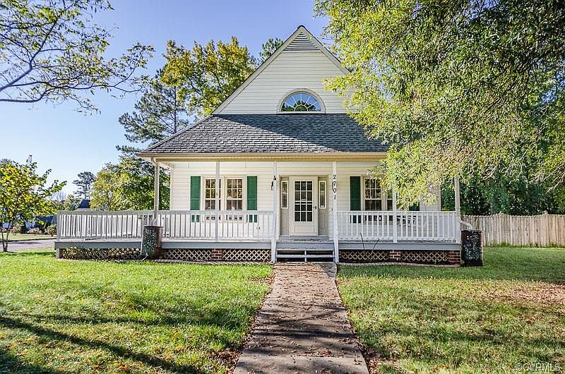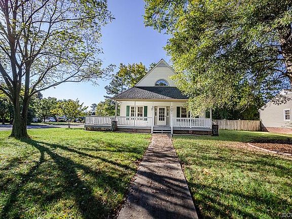 Vinyl sided Cape with wrap around front and side porch. Super clean and move-in ready with 3 bedrooms, all w/walk-in closets, and 2 full baths. Primary bedroom on 1st or 2nd level - you choose. Fresh paint on the walls & trim, and freshly cleaned carpet on the stairs and 2nd level. Beautiful hardwood floors in the kitchen/dining, living room, hall and two 1st floor bedrooms. Eat-in kitchen offers access to the wrap around porch and grilling area - ideal for indoor/outdoor entertaining. Spacious vaulted living room w/fireplace & open loft above. The flexible loft space could serve as a home office, craft room, study or virtual learning center. The fenced rear yard contains a 2-car garage which provides extra storage and has an attached workshop (w/electric), and offers space for hobbies/sports gear. EXTRAS: Roof (2017), new heat pump (2019), wood burning fireplace fitted w/gas logs, rear deck w/composite deck boards, concrete front walkway, corner lot, and a walk-in floored attic plus a pull down attic for all your storage needs. Short bike ride to Meadow Farm Museum and Crump Park and minutes away from I-295 and I-95 for a quick commute to Richmond, Hanover, Short Pump and beyond.