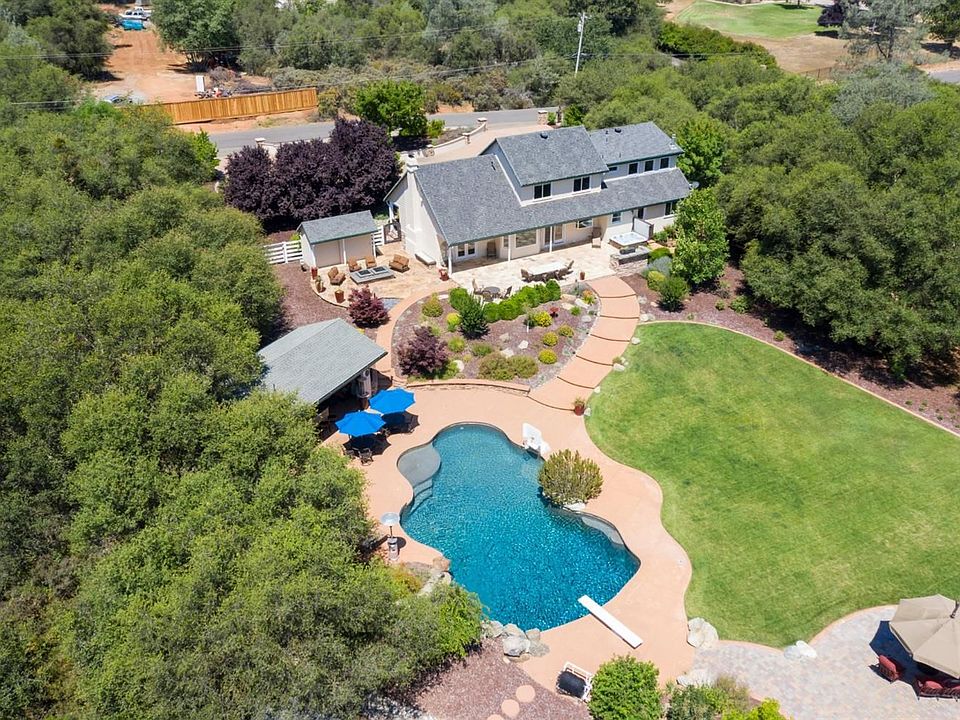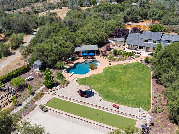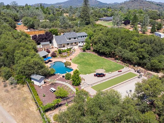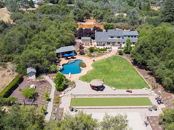 Stunning custom home with end of the road privacy. 5 acres of super flat property. Enter into a nicely remodeled home with gleaming wood floors, high ceilings and loads of windows. Remodeled kitchen with granite counters and loads of cabinets and prep space. Romantic Master Suite downstairs with small secondary bedroom or office. Upstairs 2 more bedrooms plus media/game room. Outside step into a resort like yard and salt water pool, fire pit, cabana and full bar, lounge plus bathroom and outdoor shower. Sports court, Bocce Ball garden area and chicken coop plus pasture. Something for everyone! Solar owned as well. Enjoy peaceful tranquility rural living and convenience, Perfect!