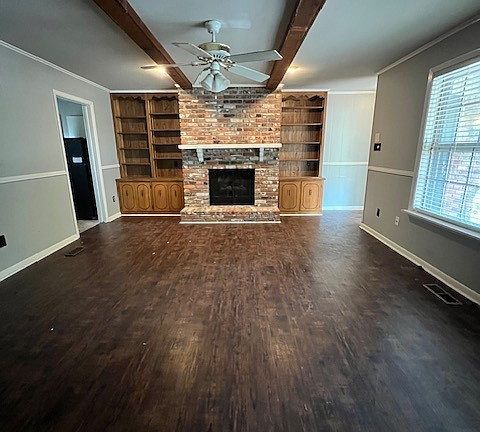 Half bathOversized great roomPrivacy fenced backyardHuge dining roomOriginal hardwood floorsFireplace with built-in shelving