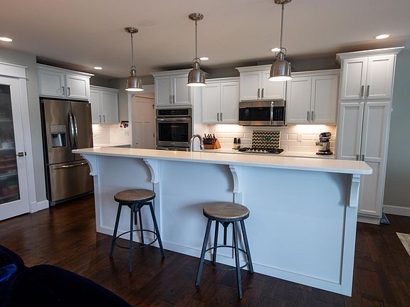 Stunning, custom built, modern walkout ranch home with exceptional curb appeal. 5 bedrooms and 3 full bathrooms. This beautiful property is located in the Hidden Vista development that features a community swimming pool, ponds, and a walking trail. The exterior features of this 2017 built home offer a striking exterior with crisp white siding and black trim, charming architectural details with stone accents, mature landscaping with a sprinkler system, and a welcoming covered front porch. Additionally one can enjoy the view of the ponds from either the lower patio or elevated back deck. Three car garage with an oversized drive is a bonus also to accommodate storage needs, boats, trailers, and or multiple vehicles. Inside the front door is a bright and airy living space with 10 foot ceilings and an open floor plan. Quality finishes throughout including solid surface countertops, hand scraped engineered wood floors, and a gorgeous kitchen with a breakfast bar. The main floor (zero entry by the way from the front entrances) has 3 bedrooms and main floor laundry. Generous primary bedroom suite with a 11 x 9' 6 walk-in closet. Downstairs one will find a large open family room with a wet bar and room for an at home office. Bedroom 4 and 5 and the 3rd bath is down here also. This home offers way more amenities than time allows here to describe so if you are looking for a move in ready home with modern style, exceptional craftsmanship, and an amenity filled NW Emporia location this is truly worth a look.