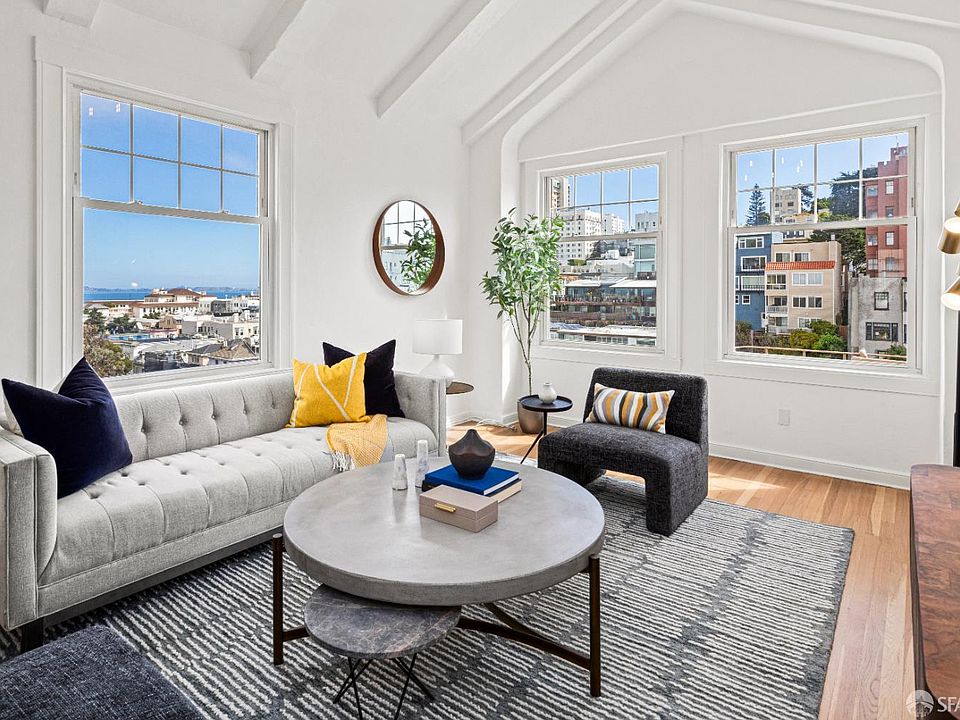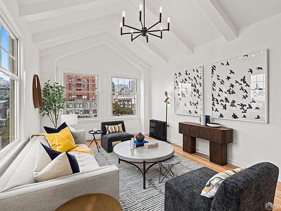 Perfectly perched atop The Marina Chateau, this top-floor northwest corner residence offers outstanding light from windows on three sides, and Golden Gate Bridge views from several windows. Just one flight up, a shared roof deck offers even more panoramic views. Located at the crossroads of Cow Hollow, the Marina, and Russian Hill, this iconic French Revival building blends architectural details with urban convenience. Inside, a soaring beamed cathedral ceiling crowns the living room, while box beams, arched doorways, and intricate moldings add character throughout. Newly refinished hardwood floors and vintage tile nod to the building's heritage, while the updated kitchen features modern appliances and space for a bistro table or home office. The dramatic lobby welcomes with a fireplace and seating. Whether you're commuting to Marin or Silicon Valley, hopping on transit, or strolling to Union, Chestnut, or Polk Streets for coffee, boutiques, or brunch, this home offers a rare blend of charm, location, and livability.