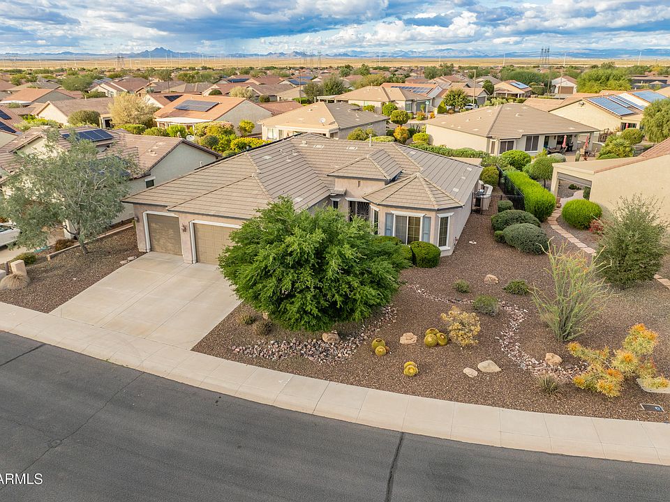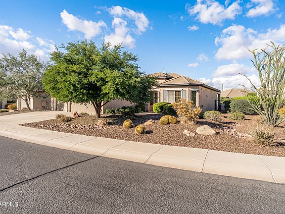 Beautifully maintained Fiesta model set on an oversized lot, offering 2 bedrooms, 2 bathrooms & a spacious office/den—perfect for work, hobbies or an extra retreat. Step inside to 10' ceilings, an open, flowing layout, tile set on the diagonal in all the right places & fresh new carpet in both bedrooms. Thoughtfully upgraded lighting brightens the great room, den & owner's suite, creating a warm, welcoming feel throughout.The chef-inspired kitchen stands out with granite counters, bar seating, granite backsplash, staggered cabinetry with pull-outs, 5-burner gas cooktop, French-door refrigerator, wine cooler, under-cabinet lighting & stylish pendant lights. The great room offers generous space for relaxing or entertaining, while the office/den provides a private getaway enhanced with surround sound also featured in the owner's suite. The owner's suite feels like a retreat, offering direct access to the backyard, a roomy walk-in closet & a bathroom upgraded with tiled walls & counters. The guest bedroom includes its own walk-in closet & connects to a Jack & Jill bath with beautiful tile surrounds ideal for guests who appreciate comfort and privacy. A well-appointed laundry room adds plentiful cabinetry, counter space, a deep sink & included washer/dryer. The 3-car garage delivers epoxy floors, built-in cabinets & a convenient service door. Outside, the extended Kool-Deck patio with pony wall creates a wonderful outdoor living area surrounded by mature landscaping & a fully fenced backyardoffering peace, privacy & plenty of room to unwind.