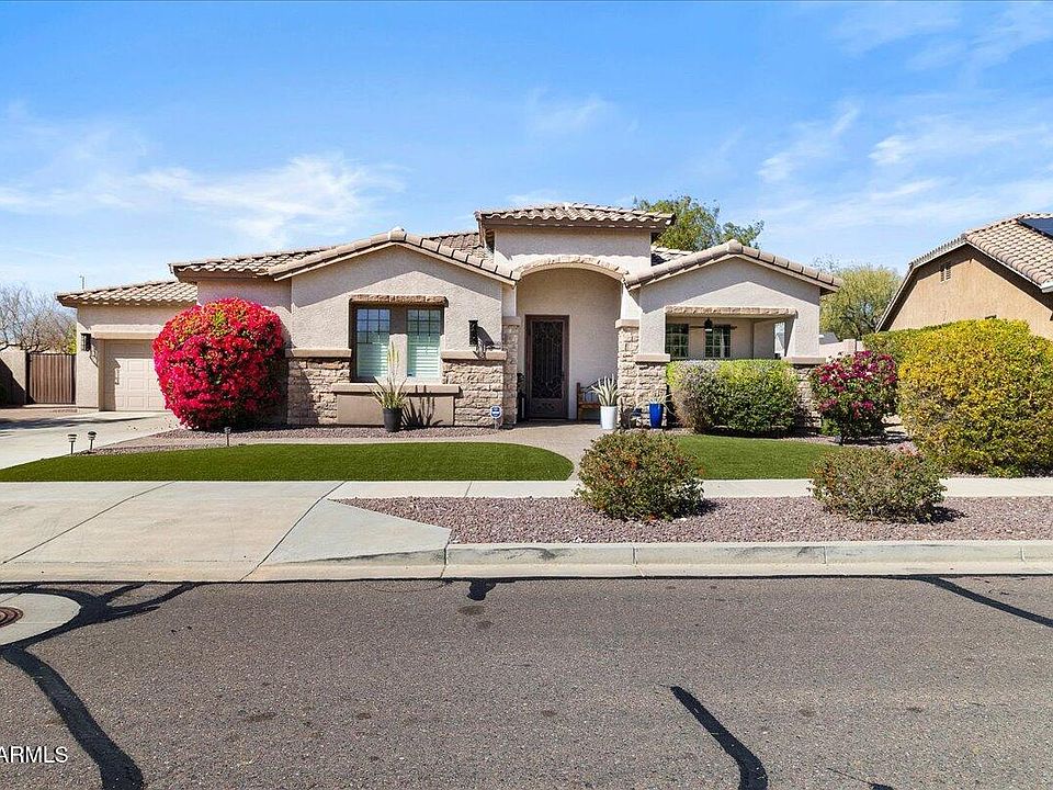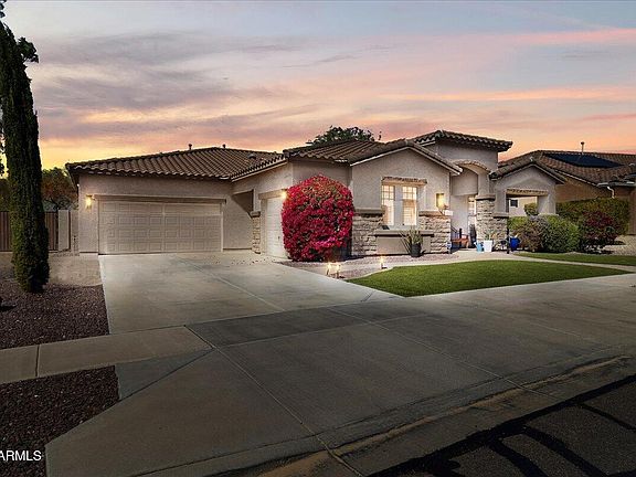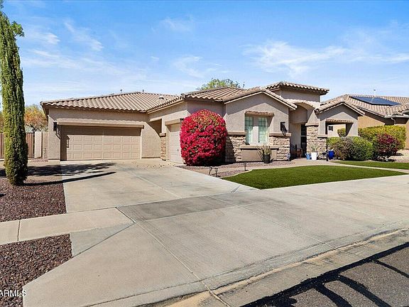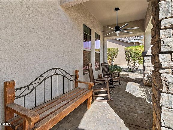 The gourmet kitchen is a chef's delight, featuring high-end stainless steel appliances, granite countertops, dual pantries and a spacious island that doubles as a breakfast bar. The primary suite is a true retreat, boasting a luxurious en-suite bathroom, walk in closet and access to the patio equipped with a misting system. Additional bedrooms are generously sized with walk in closets, providing ample space for family or guests. Outside, the backyard oasis awaits with a sparkling pool and hot tub, mature landscape and natural grass. No neighbors behind you makes this single level home perfect for enjoying Arizona's beautiful sunsets. This home has been upgraded with many conveniences like 3 new air conditioning units (2024) bird proof solar panels (leased), water softener (2024) a reverse osmosis system (2023) low maintenance turf in the front yard and many more.