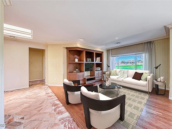 Move-in ready Golf Villa with Strip and mountain views! This upgraded home features a private courtyard, two spacious bedrooms, and an additional office/den off the kitchen. The kitchen boasts refinished cabinetry, stainless steel appliances, and breakfast bar. The bright primary suite includes a makeup/sitting area, bay window with stunning golf views, and an en suite bath with large walk-in shower, dual sinks, and custom mirrors. The large secondary bedroom offers wood flooring, crown molding, and courtyard views. Additional upgrades include wood and marble tile flooring throughout, custom built-ins, a jacuzzi tub, two-tone paint, custom wallpaper, multiple skylights, and upgraded window coverings. The HOA maintains both the front and backyard, while the backyard provides a covered patio, low-maintenance landscaping, and stunning golf, city, and mountain views. Located in a top-rated 55+ community with world-class amenities, this home offers an exceptional lifestyle!