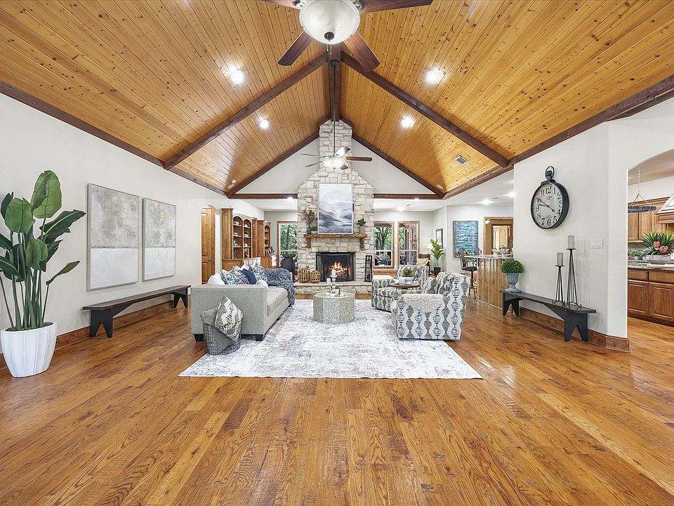Discover the ultimate Hill Country retreat on 24+ gated acres, where privacy, peace, and purposeful design come together in this custom-built masterpiece. As you drive through the private gate, you'll pass mature trees, a scenic pond with dock, and a massive workshop with electric, full bath, and RV hookups—perfect for hobbies, business, or storage. The home itself is a rare blend of rustic charm and modern convenience. Step inside to soaring vaulted ceilings, a striking stone fireplace, and an open-concept layout that connects the chef’s kitchen to the living and dining areas. The kitchen features a gas stove, double ovens, a built-in refrigerator and a separate built-in freezer, large island, and extensive cabinetry—ideal for entertaining or quiet evenings at home. The primary suite is your personal sanctuary with pool access, dual vanities, steam shower, his & hers closets—including one that’s over 14x14—and **two bonus rooms** ideal for a gym, in-home massage, or future sauna. On the opposite side of the home, two additional bedrooms share a jack-and-jill bath and private flex space—perfect as a guest suite, office, or teen retreat. One even has direct access to the backyard oasis. Outside, relax on the covered patio overlooking the sparkling pool and expansive land. With drive-through parking, two garages (three bays total), extra storage rooms, and high game fencing surrounding the property, this estate is as practical as it is beautiful. A hidden gem on Hidden Trails Rd—this home is more than a place to live, it’s a lifestyle.
