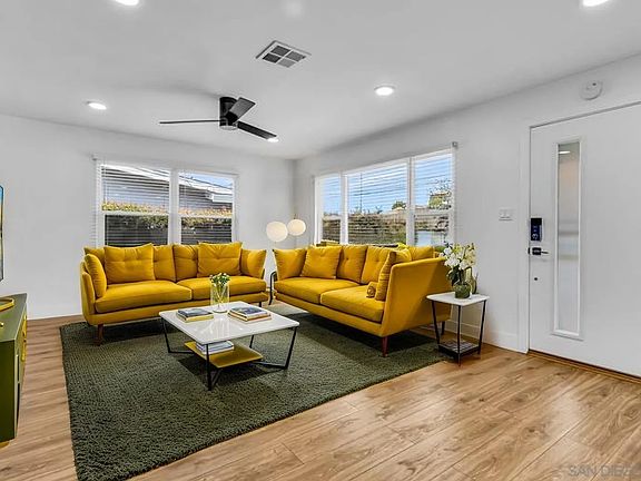 Welcome to your dream SoCal retreat! This fully reimagined 3-bedroom, 2-bath home blends modern sophistication with effortless comfort. Thoughtfully redesigned, the open-concept layout flows seamlessly through the living, dining, and custom chef’s kitchen—featuring high-end granite countertops, a multifunctional island, air-fryer oven, beverage fridge with dual ice makers, and a panel-ready dishwasher for a sleek, integrated look. The spa-inspired bathrooms include an ensuite primary bath with dual walk-in shower, backlit mirrors, and chic monochromatic tiling. Upgrades include a new energy-efficient HVAC system, designer lighting, all-new electrical, and a bold yet timeless Sherwin Williams Hale Navy accent throughout. Step outside to your private Mediterranean-style oasis with a sparkling pool, TV-ready outdoor living room with gas line, and expansive deck—perfect for entertaining or relaxing with canyon views. Located minutes from downtown, North Park, and Coronado’s beaches, with easy freeway access. This is San Diego living at its finest.