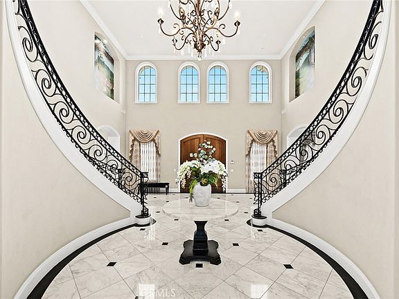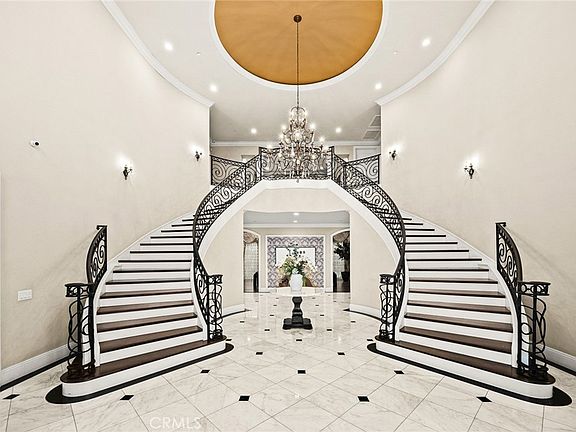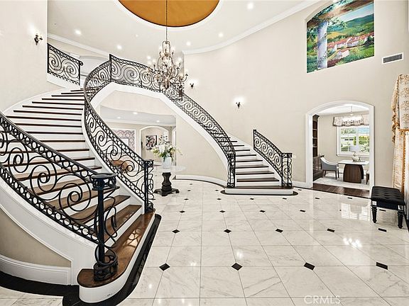 This stunning 2015-built Spanish-style estate offers luxury living across 7,285 sq ft, perfectly set on a sprawling 16,674 sq ft flat lot. With soaring 12-foot ceilings and custom tinted windows, natural light pours in to highlight the home's expansive elegance and warm ambiance. Upstairs, there are four en-suite bedrooms; downstairs, you'll find two en-suites plus an additional separate bathroom. Beautiful wood floors lead through an inviting layout that includes a formal dining room ideal for gatherings, a cozy tea room, a spacious home theater, and a wet bar for entertaining. The gourmet kitchen is a chef’s dream—fully outfitted with premium stainless steel appliances, a large center island, and a sunlit breakfast nook. The main floor also features a generous private guest suite, perfect for extended stays or multigenerational living. Upstairs, the oversized primary suite is a true retreat, complete with dual walk-in closets, a spa-like bathroom, and a large balcony overlooking the lush backyard and sparkling pool. Three additional en-suite bedrooms complete the upper level. Step outside to a resort-style backyard with a built-in BBQ, outdoor seating area, and mature landscaping—ideal for both intimate moments and grand celebrations. Meticulously designed with exceptional craftsmanship, this rare property offers a timeless blend of comfort, sophistication, and space for a lifetime of luxurious living.