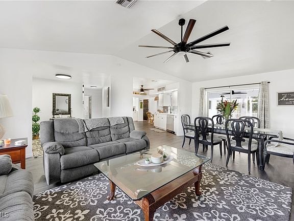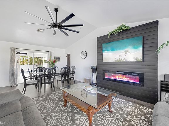 Welcome to your tropical retreat in the heart of Southwest Cape Coral. This stunning pool home has been completely remodeled from top to bottom, and the sellers have even added a brand new pool cage for you to enjoy from day one. Step inside and feel the warmth of the open living area, featuring a built-in electric fireplace and beautiful views of your private pool oasis. The kitchen is a showstopper with quartz countertops, new cabinetry, a farmhouse sink, stainless steel appliances, and a convenient pass through window to your pool bar, perfect for entertaining guests. The primary suite offers direct access to the pool area through sliding doors, along with his and hers walk-in closets and a gorgeous updated bathroom featuring dual sinks and a walk-in shower designed for relaxation. The home also includes a versatile den that can serve as a guest room, home office, gym, or media space. Each guest bedroom has its own walk-in closet and plenty of natural light. Step outside to your massive screened patio and pool area, ideal for hosting gatherings or simply soaking up the sun. With desirable southern rear exposure, you’ll enjoy sunshine throughout most of the day. The roof was replaced in 2021 and remains in excellent condition. This home truly offers the best of Florida living, combining comfort, style, and value in one incredible package. It is completely move-in ready and priced to sell quickly. Don’t wait to make this tropical pool home yours—schedule your private showing today.